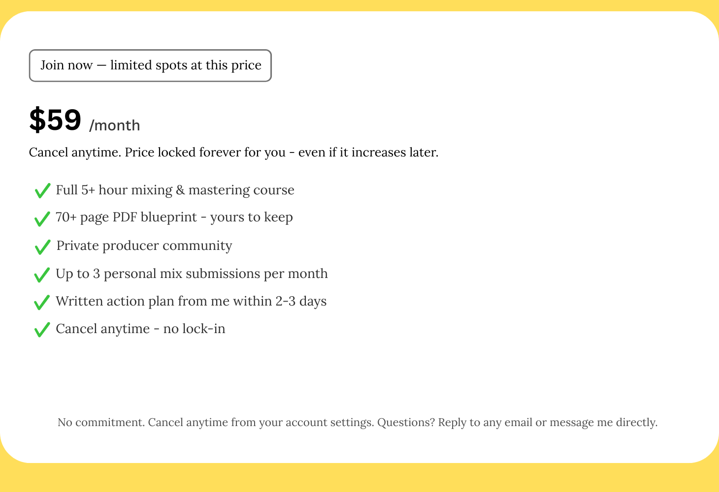 Every member's pace is different but the blueprint is designed to give you clear, actionable progress from the very first module. Most members learn something valuable from the course alone — and the personal submissions accelerate that significantly by giving you direct feedback on your actual music, not generic advice.
