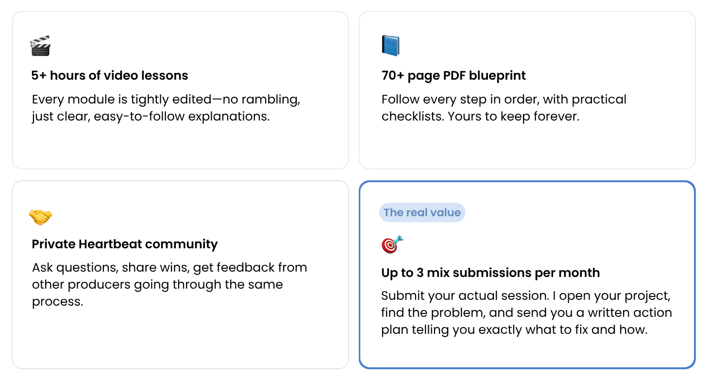 The Mixing Lab was built for exactly where you are. The blueprint starts from the very beginning — session setup, organisation, every decision in order — so there's no assumed knowledge. If you can open a DAW and have tracks you want to finish, you have everything you need.